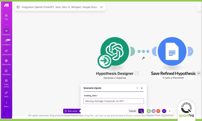 Let’s convert our agentic quant research pipeline into a functioning agentic AI workflow using Make.com. The goal is simple - to get a complete backtest-ready python script for any raw trading idea the user inputs.
